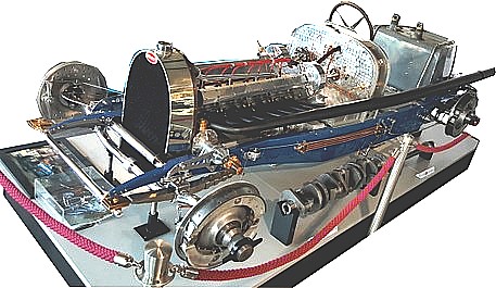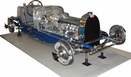 Um dem Betrachter mehr Einblicke in den Mythos Bugatti T 59 zu gewähren, welcher als letzte GP-Rennwagenentwicklung (750 kg Klasse) von Bugatti gilt, hat das Museum AUTOVISION beschlossen, das Fahrzeug ohne dessen typische Spitzheck-Karosserie in der Ausstellung zu präsentieren. Da es sich bei dem eingebauten Motor um das gleiche Grundmodell aus der bekannten Bugatti T 57-Motorenserie handelt, musste man eine ganze Reihe konstruktiver, im Schwerpunkt leistungssteigernder Maßnahmen vornehmen, um das Fahrzeug für GP- Rennen zu rüsten. An dieser Stelle darf man allerdings auch die Tatsache nicht unerwähnt lassen, dass dieser letzte Grand Prix Rennwagen im internationalen Wettbewerb nicht weiter bestehen konnte. Sowohl die deutschen Mercedes Silberpfeile als auch die 16-Zylinder Auto Union-Rennfahrzeuge hatten nicht nur mehr Motorleistung zu bieten, sondern zudem moderne Einzelrad-Fahrwerke. Überall wo diese Rennwagen damals antraten, war der Rennsieg vorprogrammiert. Der konservativ ausgerüstete Bugatti T 59 hingegen hielt noch immer am Starrachsen-Rennfahrwerk fest, welches Jean Bugattis Vater Ettore bereits in den 1920er Jahren entwickelt hatte.